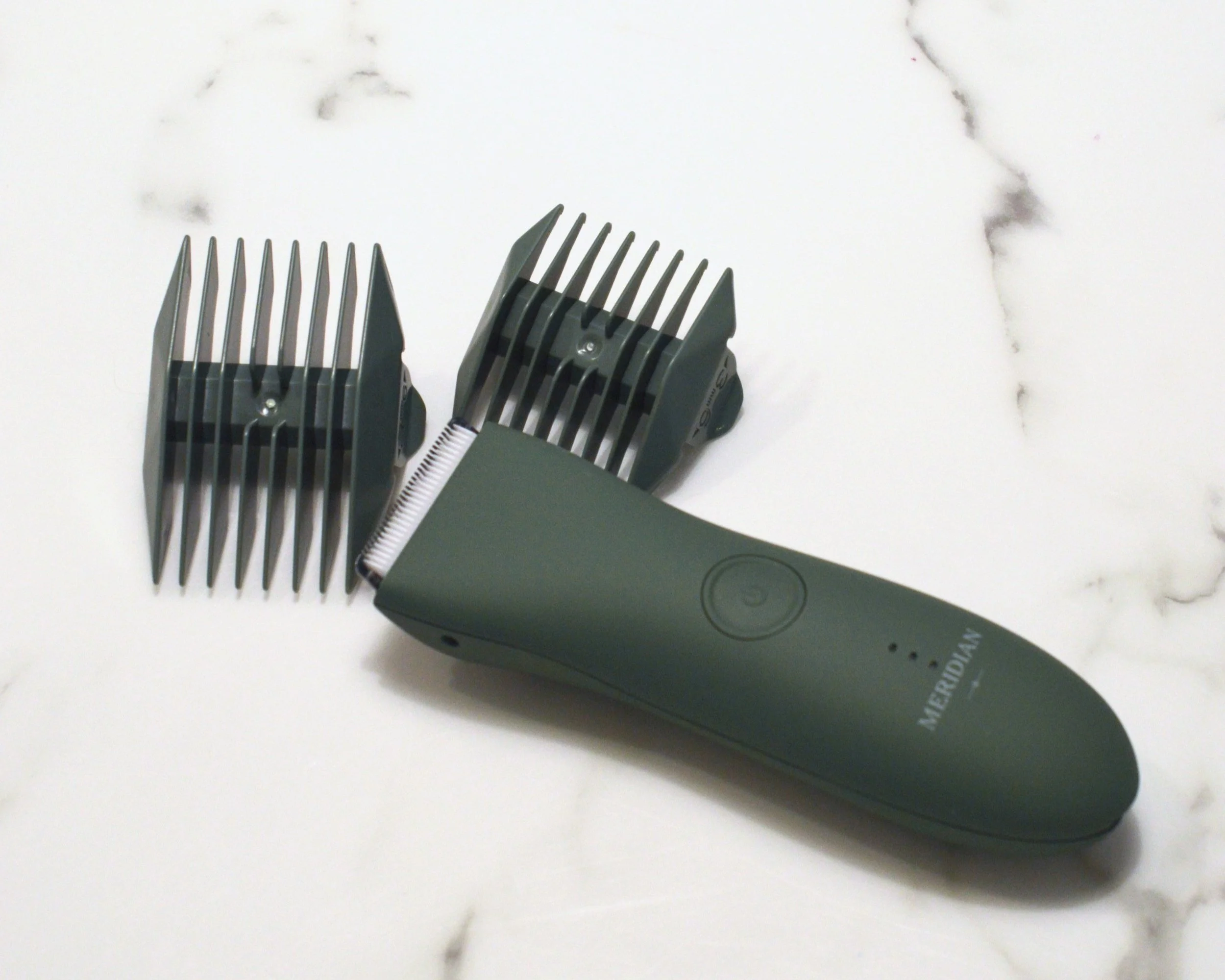 The Meridian comes with two 2-sided guards (so four length options), plus a cleaning brush and charging cord.